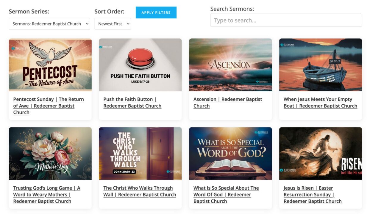 The Sermon Gallery WordPress plugin transforms your chaotic sermon archive into a beautiful, organized gallery that makes it easy for people to find exactly what they need before they click through to watch on YouTube.