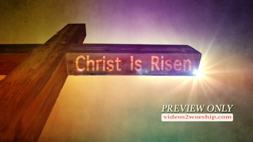 Resurrection Sunday still background featuring a large wooden cross and the text “Christ Is Risen” over a colorful backdrop. Available in HD only!
